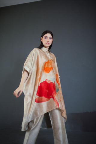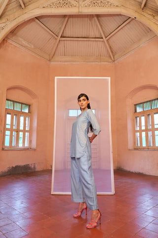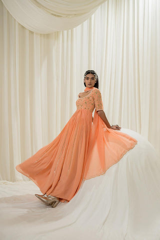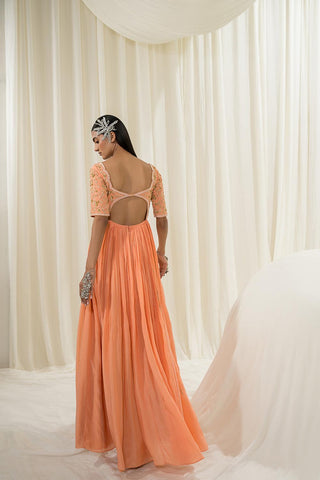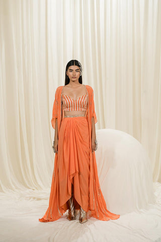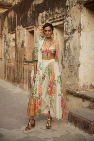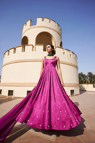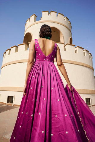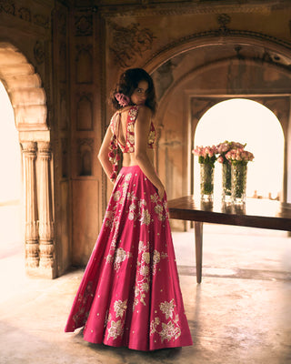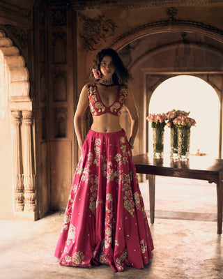Magenta Floral Embroidered Neckline Bralet with Jacket and Cowl Skirt