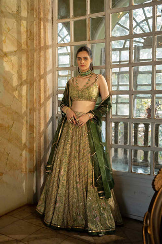 Moss Green Georgette Tiered Skirt And Draped Dupatta Set