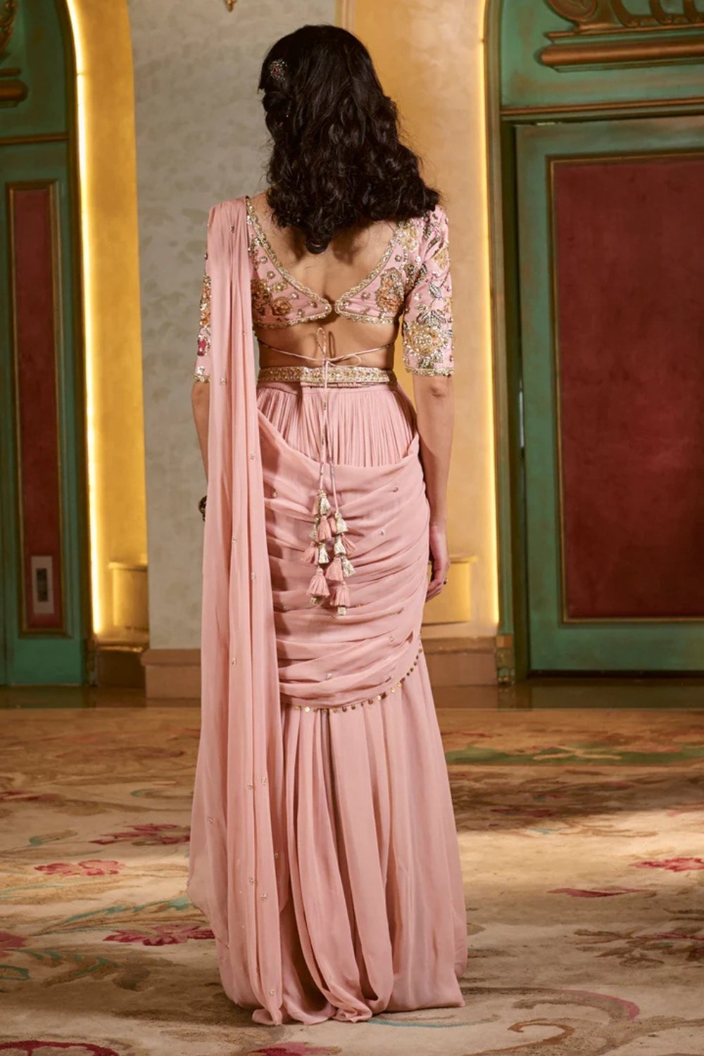 A romantic light pink pre–stitched cocktail saree, hand–embroidered in delicate floral motifs and lace detailing, evoking the charm of a bygone era. The pallu features metal sequin work and floral buttis. It is paired with a signature Paulmi and Harsh printed blouse with rose gold embroidery and a hand-embroidered belt.