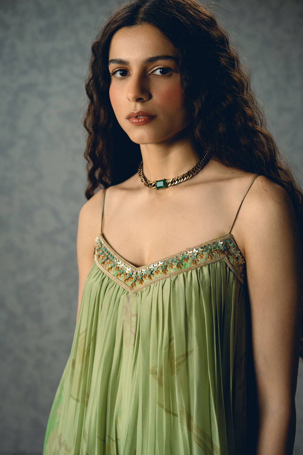 A green printed flared jumpsuit with a dress-like silhouette, effortlessly chic and feminine.