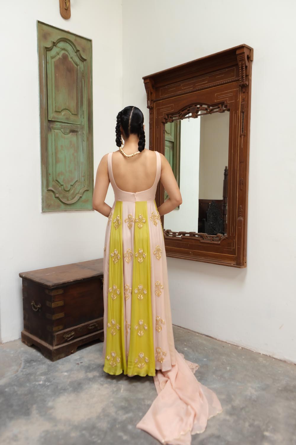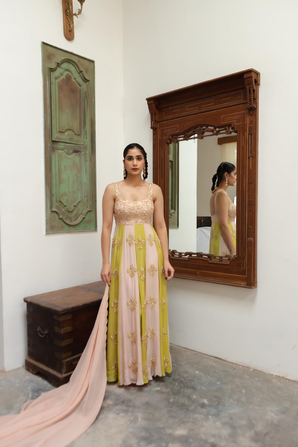 Our Light Baby Pink Anarkali features a beautiful two tone design composed of two complementary shades.  The front yoke features an elegant floral jaal design that catches the light, while the kalis are detailed with stunning motifs and butti embroidered scalloped edge dupatta completes the look.