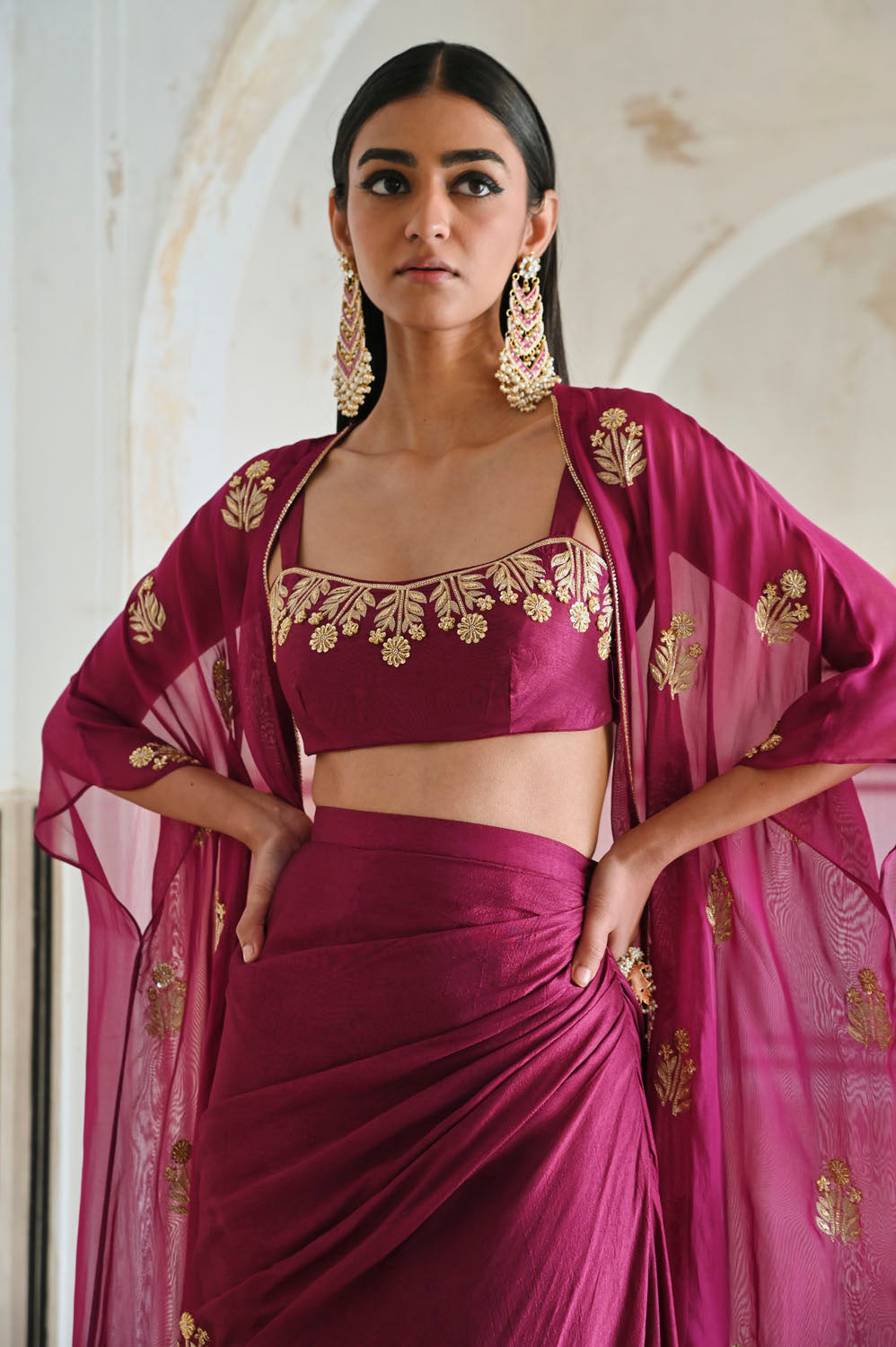 Magenta Floral Embroidered Neckline Bralet with Jacket and Cowl Skirt