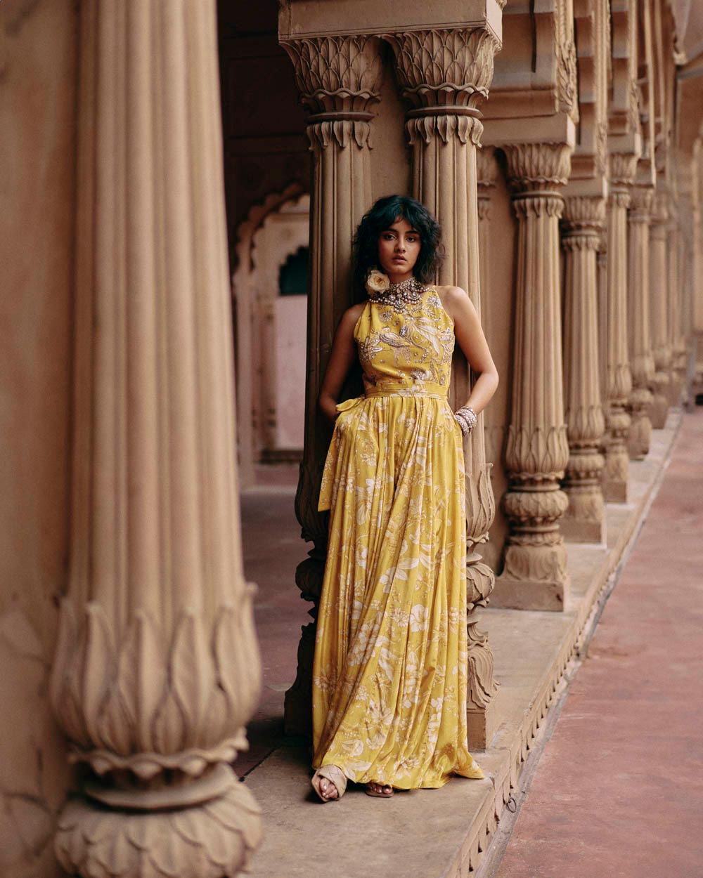 A tuscany yellow jumpsuit featuring Paulmi and Harsh signature Roop flip bird print, featuring a pair of birds in their enchanting habitat. The print is enhanced with hand-embroidery in zardozi and aari work and the look is complete with a printed belt.