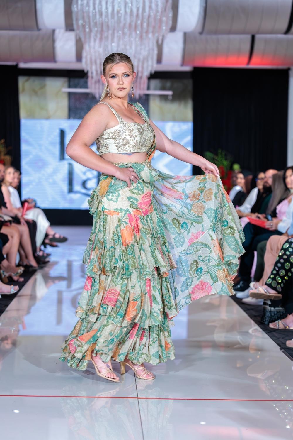 This exquisite, pre-draped saree is crafted from a light-as-air chiffon fabric and comes with an embroidered blouse. A rich green and ivory floral printed pre-draped chiffon ruffle saree featuring elegant prints and tiered lace detailing that adds a fluid movement. It is paired beautifully hand-embroidered blouse to complement the saree's graceful charm.