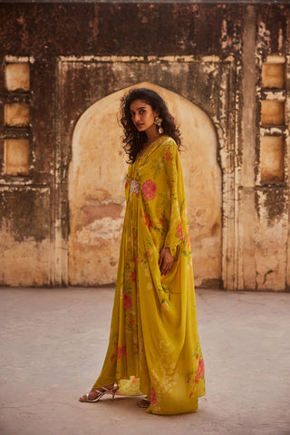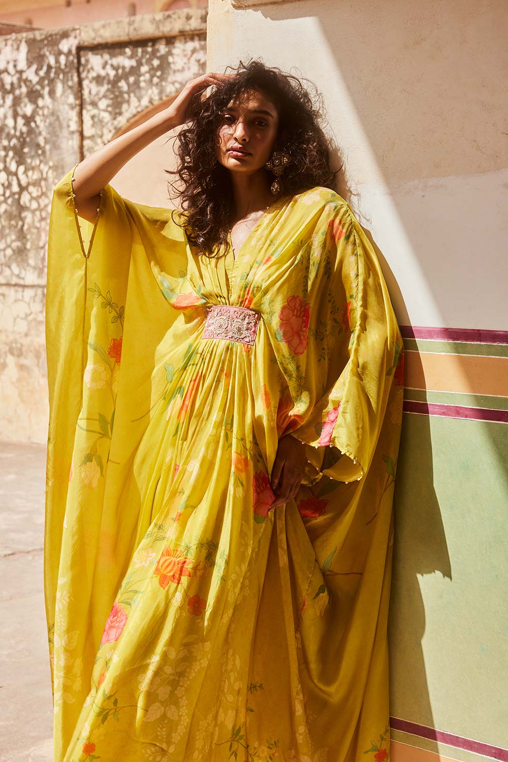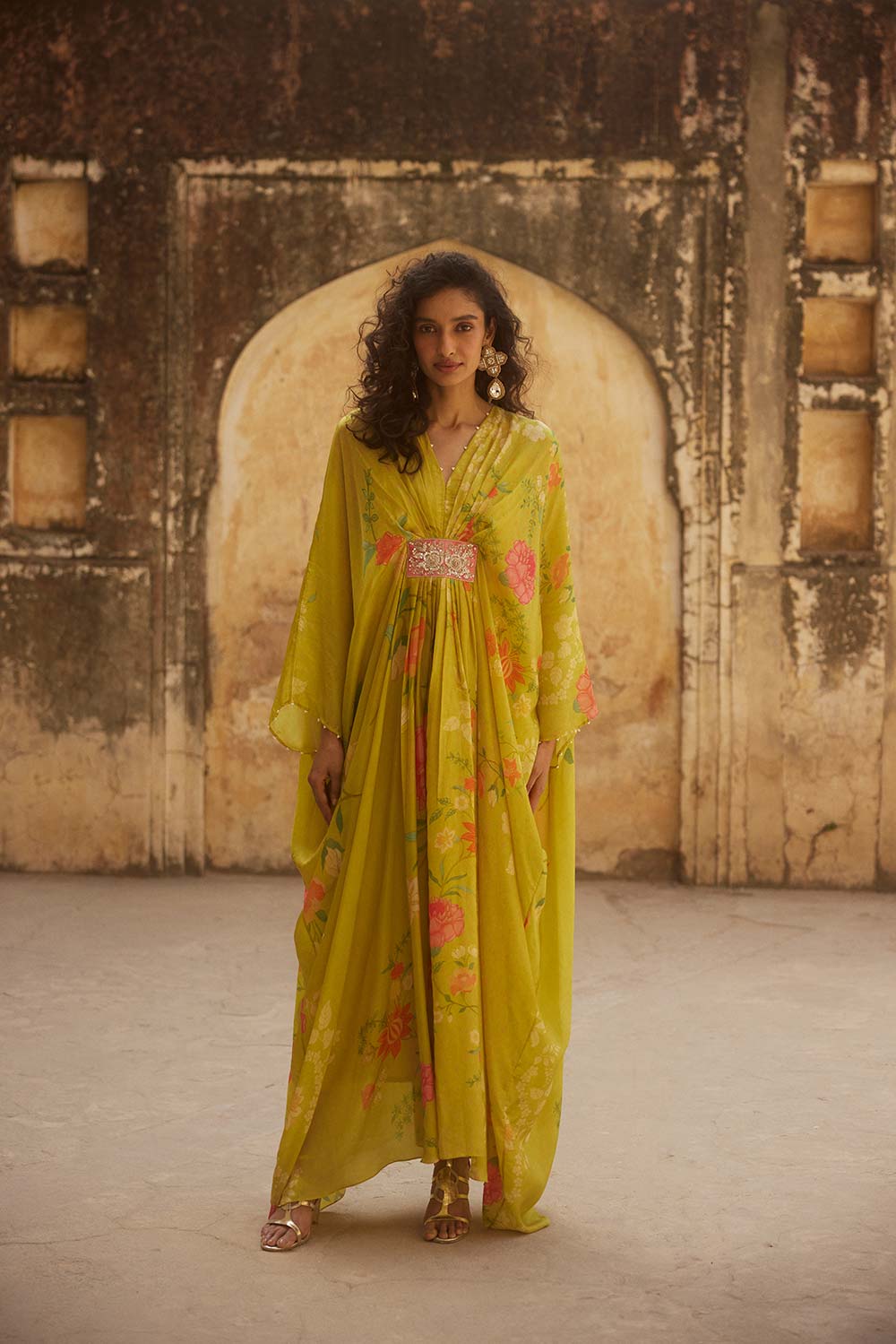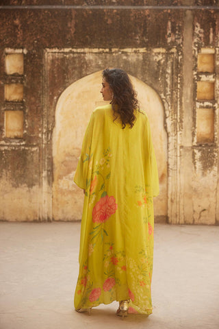 A lime yellow kaftan set crafted from placement printed pure habutai silk. It features a hand–embroidered patch and dainty details on the sleeves and neck.