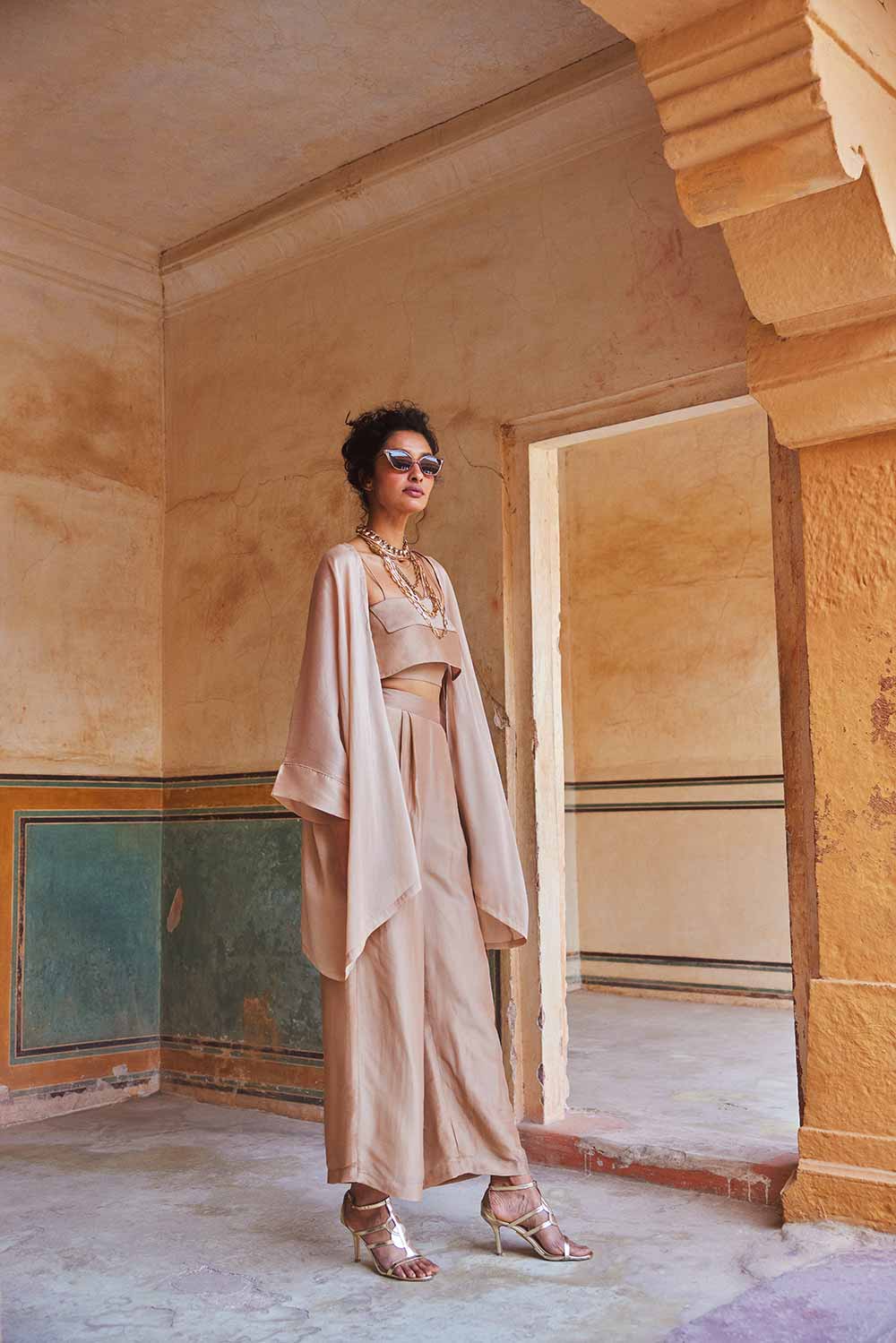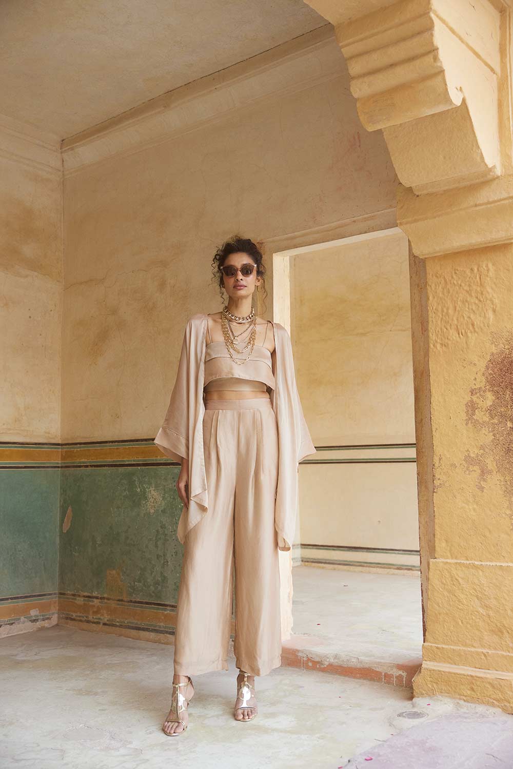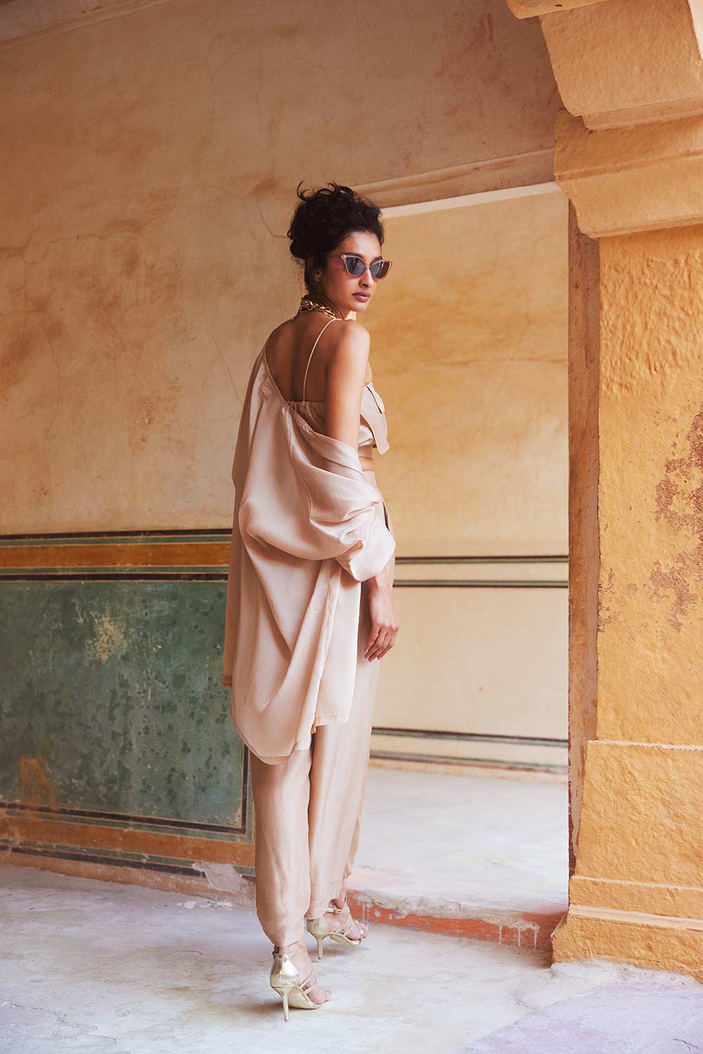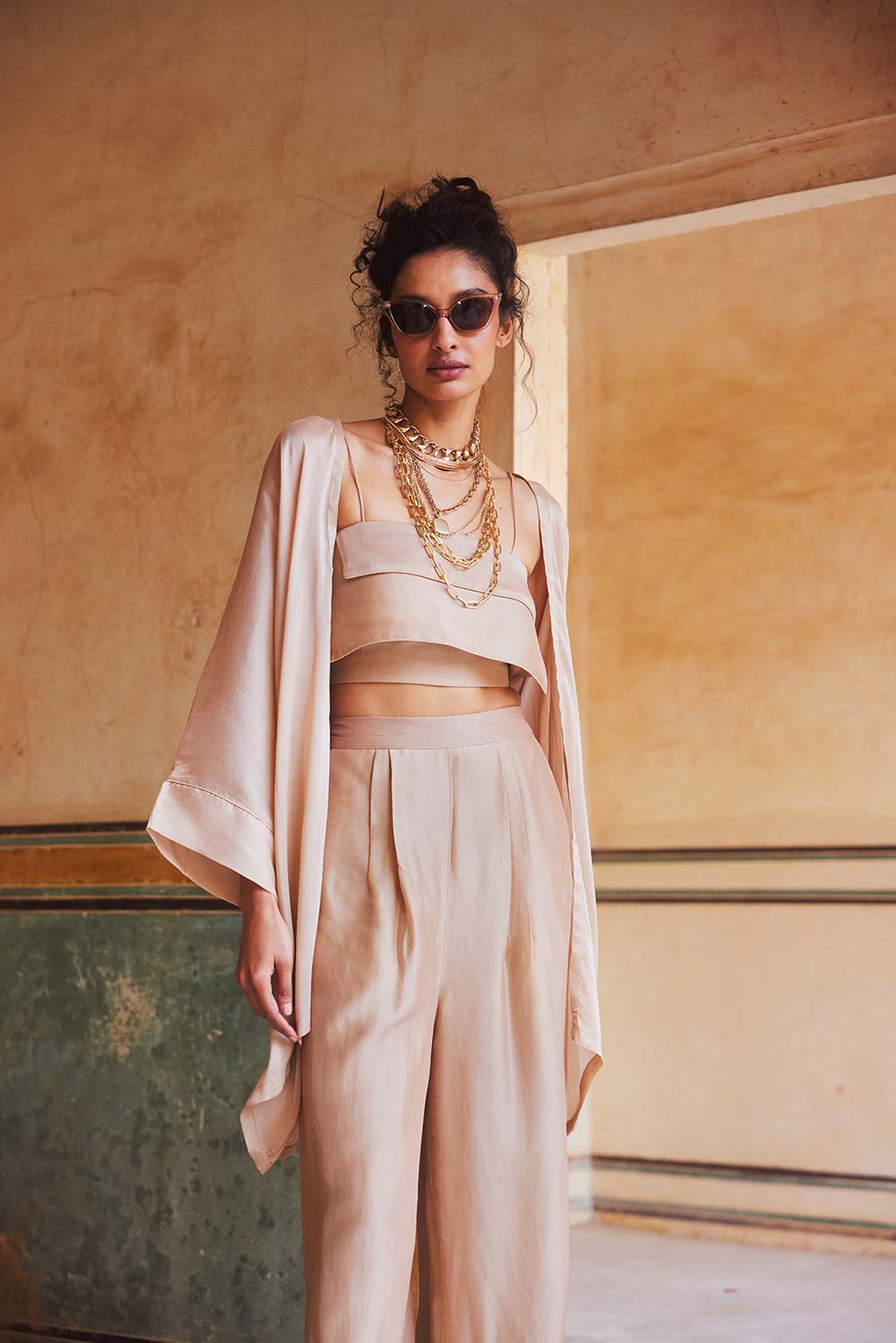 A soft shell pink jacket set, oozing effortless femininity. The trousers are designed for both style and functionality, and is paired with a blouse that has delicate satin piping and a relaxed fit jacket.