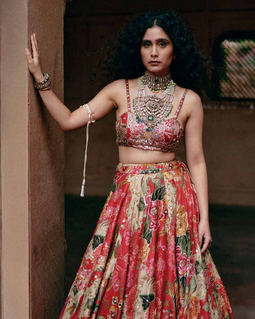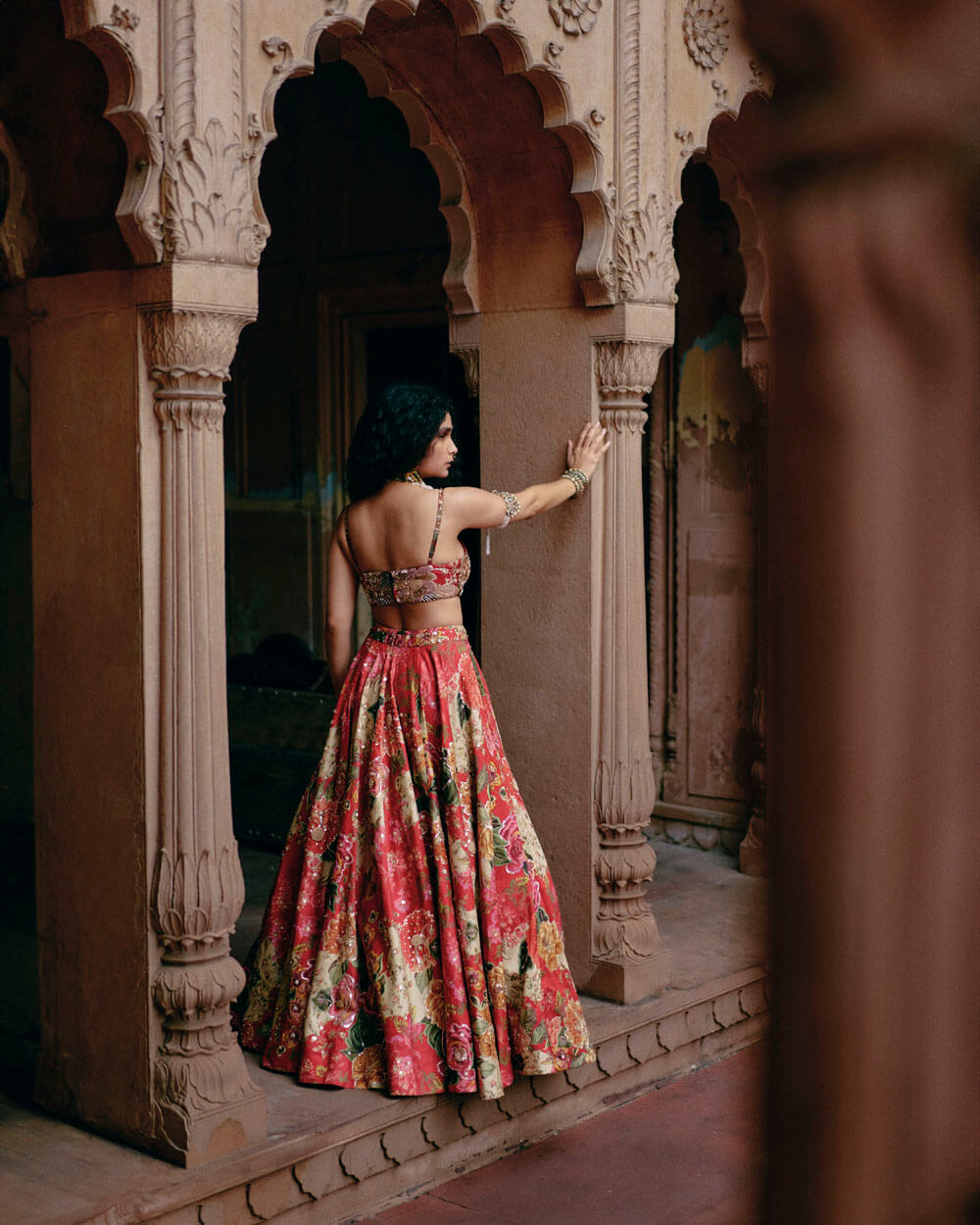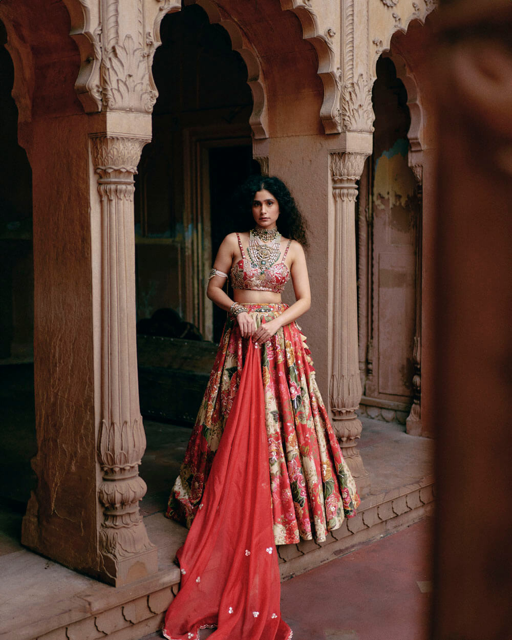 A red map printed lehenga set with a heavily hand-embroidery strappy blouse, and hand-embroidery print highlights on the lehenga. It is paired with a scallop embroidered dupatta.